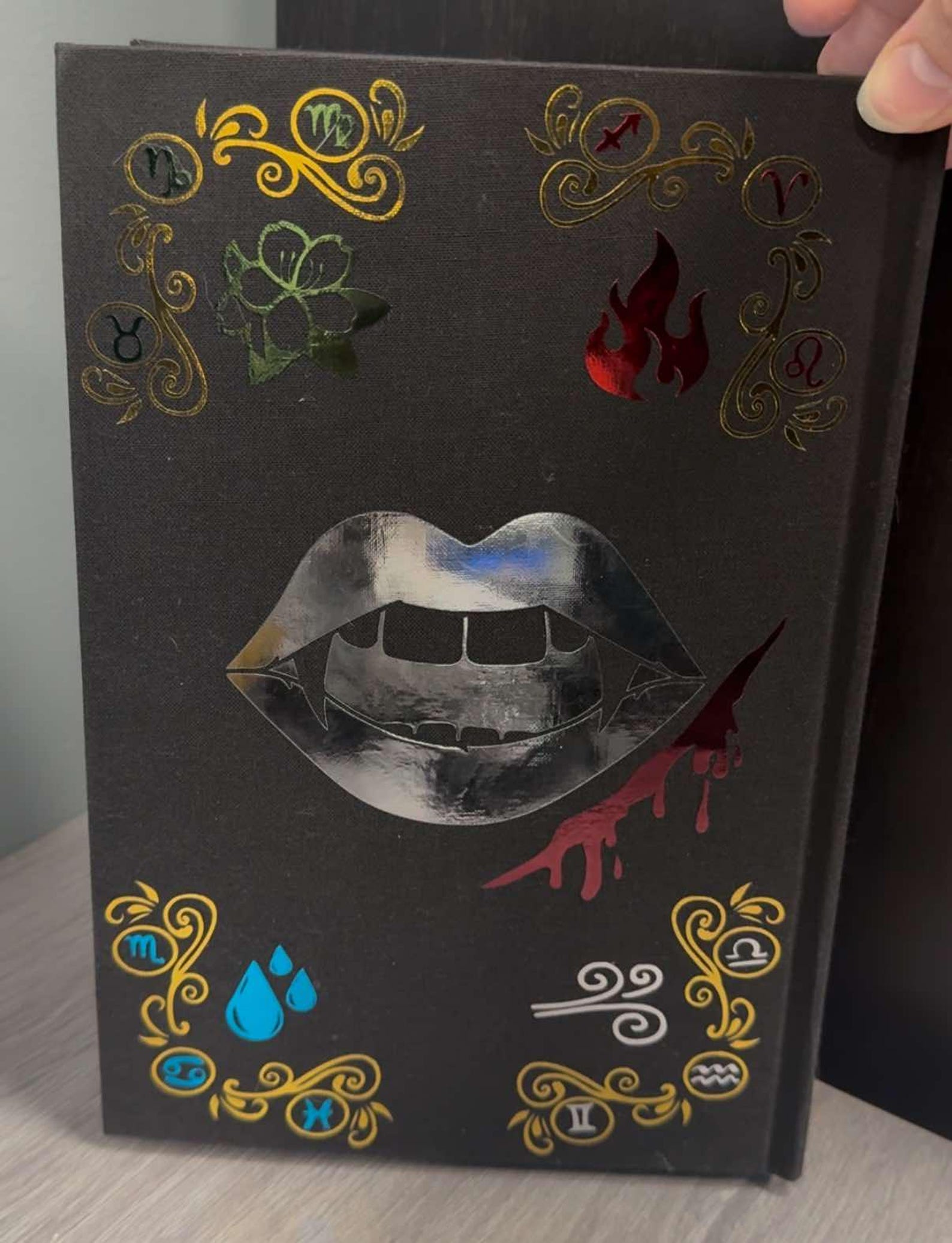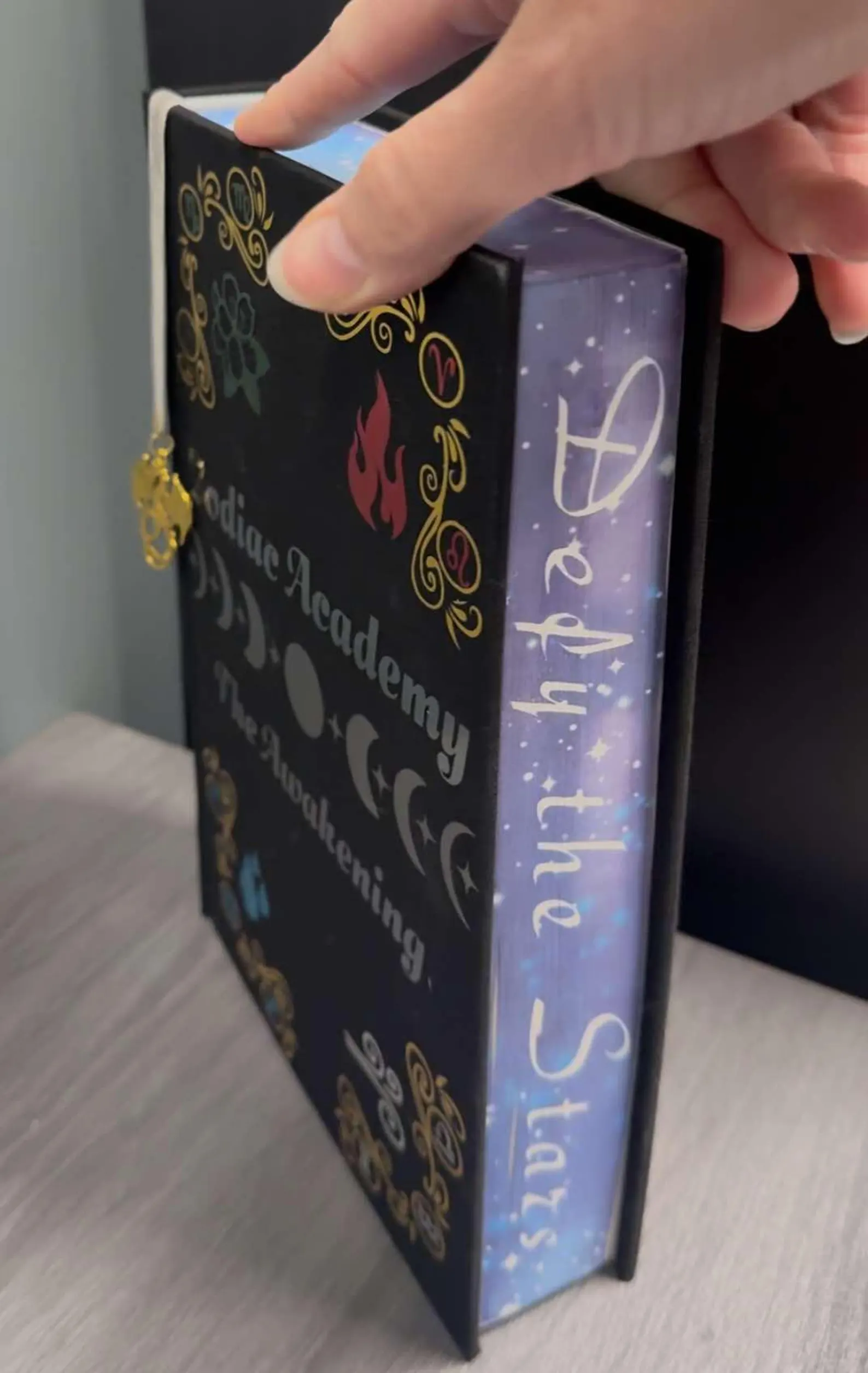 Custom edition of Zodiac Academy The Awakening, written by Caroline Peckham and Susanne Valenti. Featuring sublimated edges, foil cover, and built-in bookmark. End papers, bookmark color, and charm may vary based on supply availability. This book can be further customized if desired, such as removing the bookmark, changing the colors, or requesting different end papers or charms. Addition costs may apply to certain requests.